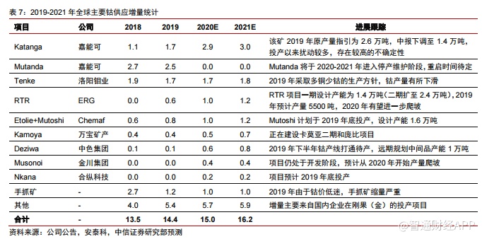 1)嘉能可旗下Katanga项目2020/2021年将增产至3.0/3.6 万吨,较2019年增加超过2 万吨;