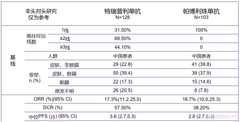 智通财经APP了解到,通过将两个针对中国黑色素瘤患者的独立单臂注册研究进行横向结果比对发现,特瑞普利单抗ORR达到17.3%、DCR达到57.5%、中位PFS则达到3.6个月,以上数据均优于K药的治疗数据。