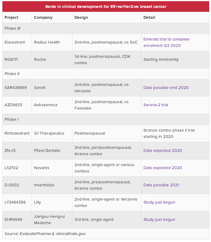 第一代SERD药物为阿斯利康开发的氟维司群,于2002/4/25获得FDA批准,用于治疗雌激素辅助治疗后复发的ER+乳腺癌以及与CDK4/6抑制剂 palbociclib联合,治疗经雌激素治疗后发生转移的ER+/HER2-乳腺癌。ER+/HER2-乳腺癌约占乳腺癌患者的70%。EvaluatePharma近期梳理了这一领域的在研药物,具体如下:
