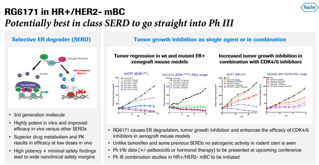 其中,罗氏在上个月表示其SERD药物RG6171即将进入III期临床试验,将联合CDK抑制剂用于一线治疗ER+/HER2-乳腺癌,并称其有潜力成为best in class的SERD药物。