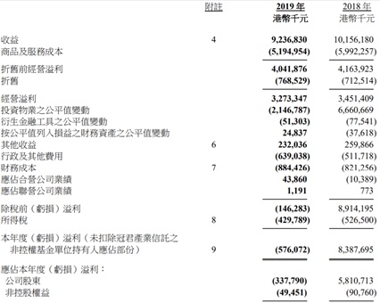 费用全面增加叠加投资物业公平值大幅减少,鹰君利润数据出现剧烈波动。智通财经APP了解到,由于商品及服务成本大幅下降13.31%至51.95亿元,公司折旧前经营利润其实仅小幅下滑2.93%至40.42亿元,不过在扣除分别同比增长7.86%、24.88%、7.69%至7.69亿元、6.39亿元和8.84亿元的折旧、行政开支、财务成本等费用,再加上因香港社会性及经济前景问题,冠君产业信托旗下朗豪坊商场、朗豪坊办公大楼、花园道三号等商业物业投资公平值评估大幅减少,以致于投资物业公平值变动由去年同期的66.61亿元正值转为21.47亿元负值后,公司税前亏损达到了1.46亿元,较去年同期89.14亿元的税前利润相去甚远。之后扣除所得税以及去除冠军产业信托的非控权基金持有人部分后的股东应占亏损达到了3.38亿元,去年同期则是盈利58.11亿元。