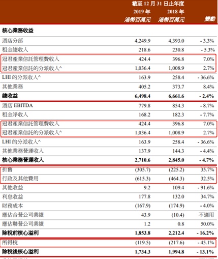 即使按照公司核心业务计算业绩,鹰君业务盈利能力同样出现明显的下滑。智通财经APP了解到,除自主管理酒店分部和投资物业外,鹰君资产主要还包括冠君产业信托66.22%权益,以及朗廷酒店投资有限公司(LHI)的61.9%权益,由于2019年香港问题的影响,公司核心业务收益划分中自有酒店分部和租金总收入分别录得-3.3%、-5.3%的同比下滑,LHI的分派收入更是大幅下滑36.6%,仅冠军产业信托管理费收入和分派收入,因冠君产业信托的物业收益净额上升和代理租赁佣金收入增加录得7%、2.7%上涨,核心业务总收入同比下滑2.4%至64.98亿元。在扣除分别同比上涨35.7%、32.5%的折旧和行政及其他费用等项目后,公司税前核心业务利润同比下滑16.2%至18.54亿元,在所得税费用大幅下降的45.1%的基础上,税后核心利润同比跌幅才收窄至13.1%。
