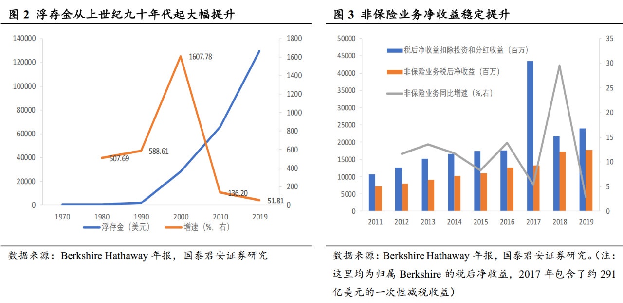 2018年,Ajit Jain和Greg Abel分别被任命为负责保险和非保险业务的副主席。保险业务主要包括基本保险和再保险,旗下子公司还持有大量投资资产,而投资组合则由伯克希尔的CEO和其他内部投资经理管理。2019年底,保险业务的浮存金规模已达到1290亿美元,在2014年的基础上增长了54%,为资产投资的重要来源。非保险业务则主要包括铁路、公用事业和能源、制造业、服务和零售等多项业务,2019年净收益占总额约22%,但总收益中包含了未实现的投资收益。若扣除投资和分红整体收益来看,占比约在73.8%。