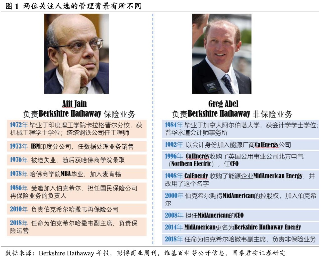 不同的路径,相同的专注。Ajit Jain ,68岁,出生于印度,1986年受邀加入伯克希尔,从事再保险业务。Greg Abel ,57岁,出生于加拿大,2000年因所在公司被伯克希尔收购而加入,从事能源业务。虽然两人进入的契机各不相同,但都在自己的领域内从事多年,并将各自部门发展壮大。因此,在2018年同时被提为副主席,分别负责保险和非保险业务。