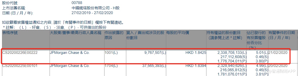 智通财经APP获悉,联交所最新资料显示,2月21日,摩根大通增持中国铁塔(00788)约976.75万股,每股作价1.8425港元,总金额约为1799.66万港元,增持后持股数目约为23.39亿股,持股比例为5.01%。