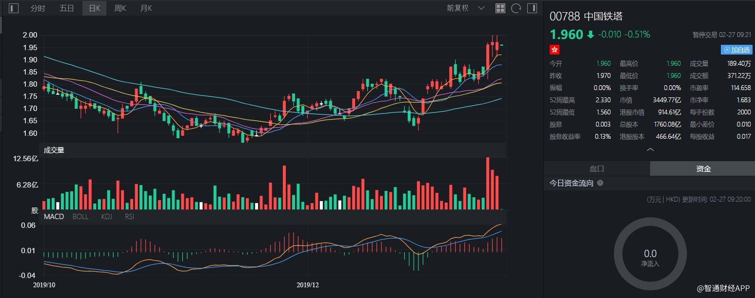 截至今日盘前竞价,中国铁塔跌0.51%,报1.96港元。