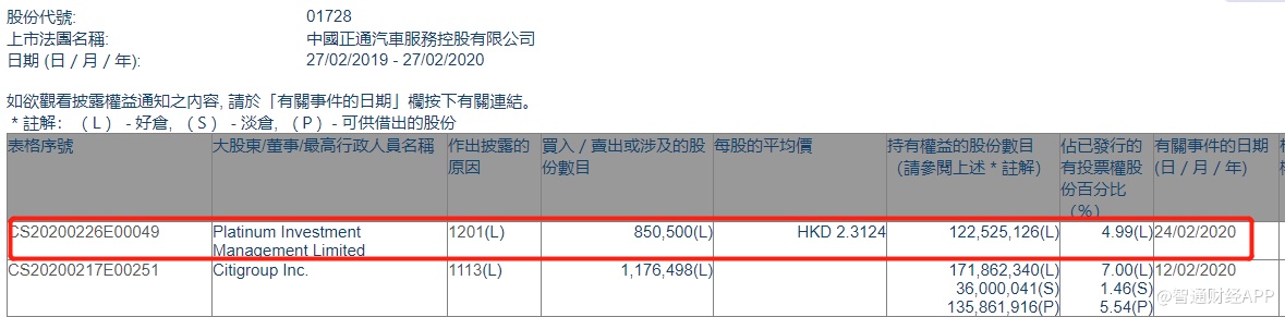 智通财经APP获悉,联交所最新资料显示,2月24日,Platinum Investment Management Limited减持正通汽车(01728)约85.05万股,每股作价2.3124港元,总金额约为196.67万港元,减持后持股数目约为1.23亿股,持股比例为4.99%。