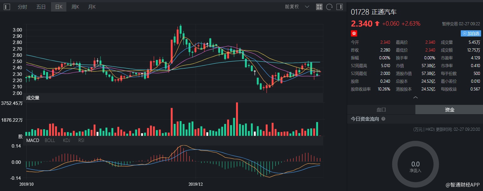 截至今日盘前竞价,正通汽车涨2.63%,报2.34港元。