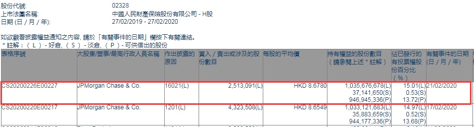 智通财经APP获悉,联交所最新资料显示,2月21日,摩根大通增持中国财险(02328)251.31万股,每股作价8.678港元,总金额约为2180.86万港元。增持后最新持股数目约为10.36亿股,最新持股比例为15.01%。
