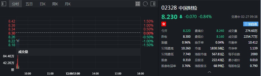 截至发稿,中国财险(02328)跌0.84%,报8.23港元。
