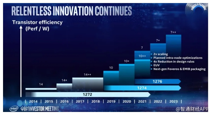 2019年英特尔在投资者会议(Investor Meeting)上展示了技术创新路线(Relentless Innovation Continues),为10纳米规划了10+和10++;并表示2021年才会推出7纳米,也明确表示采用EUV方案。7nm工艺相比10nm工艺晶体管密度翻倍,每瓦性能提升20%,设计复杂度降低了4倍。 如此看来,英特尔的先进工艺在性能提升真的遇到瓶颈了。尽管很多人都认为英特尔的14纳米相当于台积电和三星的10纳米,英特尔的10纳米可能相当于台积电和三星的7纳米。 可此时,台积电和三星已经表示推进到了5纳米时代。