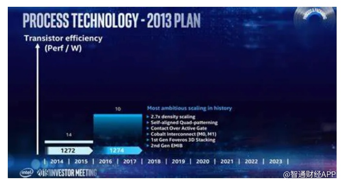 其实在2013年,英特尔就设想通过提供2.7倍密度的自对准四轴图形(SAQP,self-aligned double patterning)、有源栅极上接触(COAG,Contact Over Active Gate)、金属钴(Co)互连以及第一代Foveros和第二代EMIB等新封装技术,计划在2016年推出10nm工艺取代14nm工艺。据悉,英特尔为了提高芯片性能,在10纳米工艺开始引入金属钴在MO和M1取代氮化钽(TaN)做侧壁层,导致工艺研发进展缓慢。