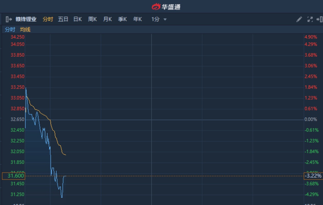 智通财经APP获悉,赣锋锂业(01772)近期遭大摩及瑞银齐降评级,该股盘中延续跌势,一度挫逾4%,截至10时17分,跌3.37%,报价31.55港元,成交额7901万。