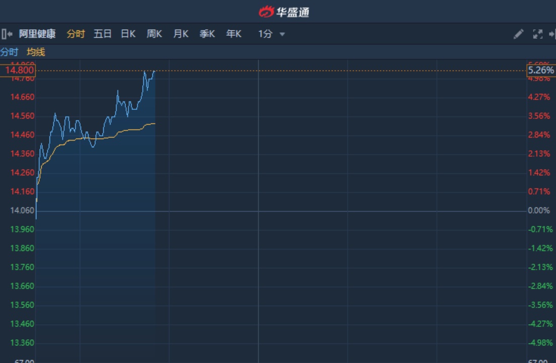 智通财经APP获悉,阿里健康(00241)近日获中金上调目标价58.7%至17.3港元,维持“跑赢行业”评级,截至10时49分,涨5.26%,报价14.8港元,成交额2.28亿。