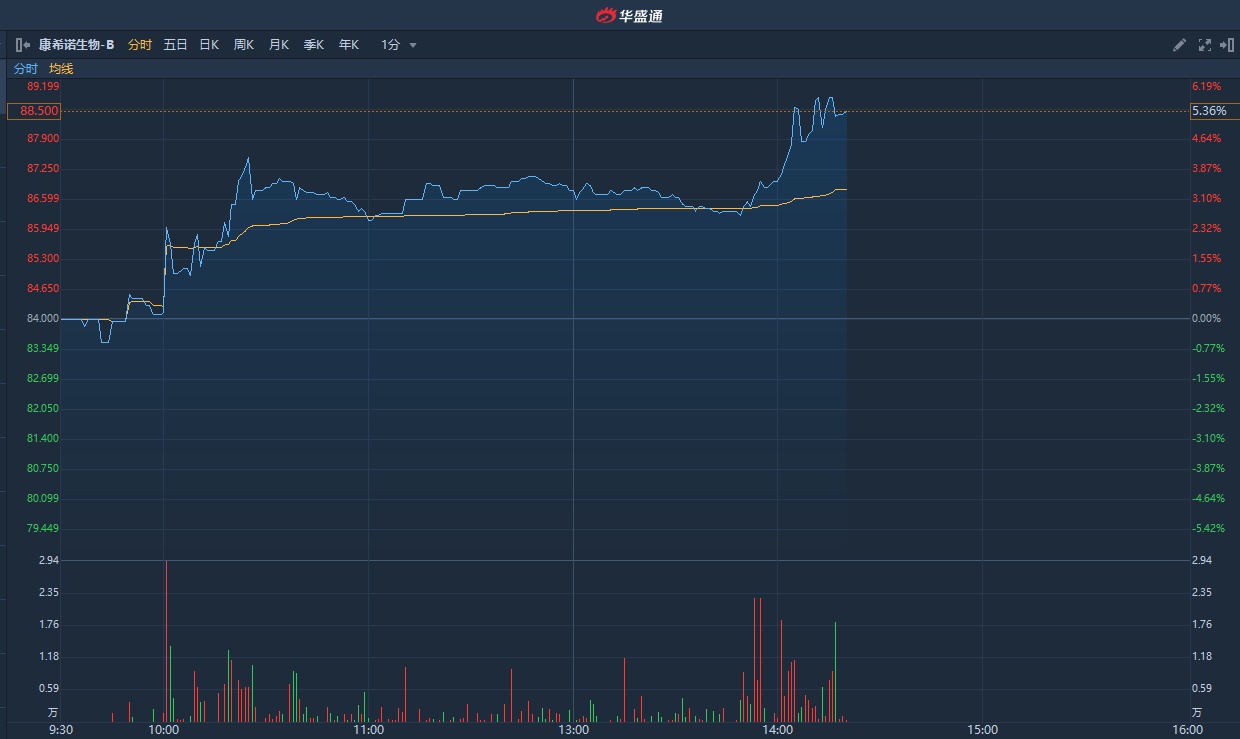 智通财经APP获悉,康希诺生物-B(06185)午后再获资金吸筹,盘中高见88.8港元,有望突破前高89.6港元。截至发稿,涨5.3%,报88.45港元,成交额4623.69万港元。