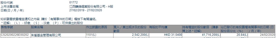 智通财经APP获悉,联交所最新资料显示,2月24日,朱雀基金增持赣锋锂业(01772)254.22万股,每股作价31.04港元,总金额约为7891万港元,增持后持股数目为4171.62万股,持股比例为20.84%。