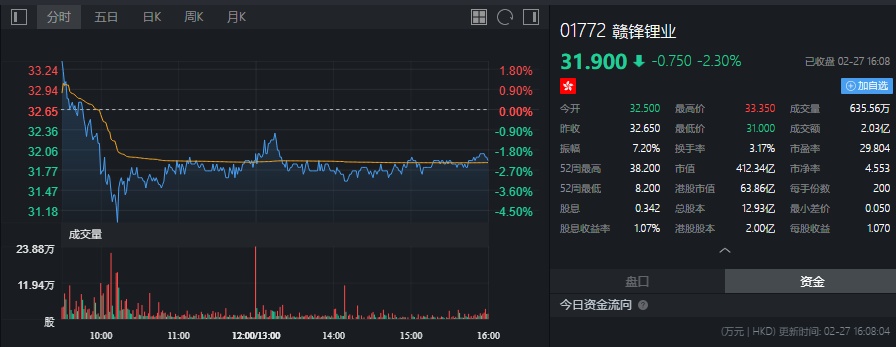 截至今日收盘,赣锋锂业(01772)跌2.3%,报31.9港元。