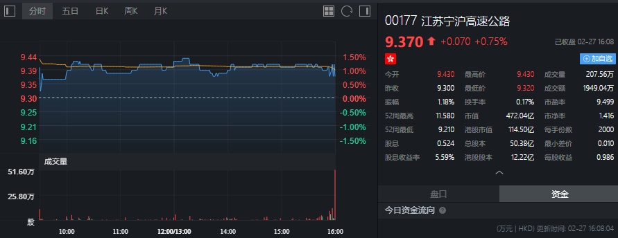 截至今日收盘,宁沪高速(00177)涨0.75%,报9.37港元。
