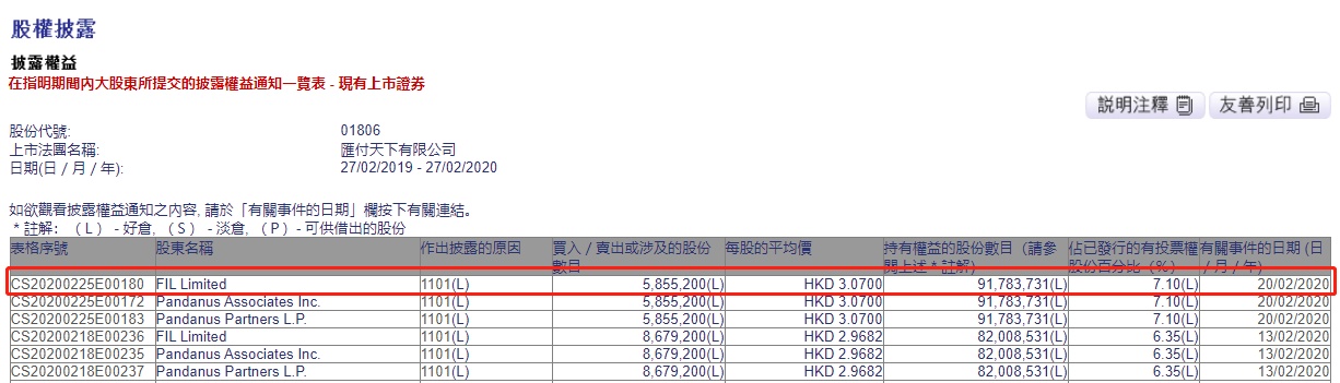 智通财经APP获悉,联交所最新资料显示,2月20日,FIL Limited增持汇付天下(01806)585.52万股,每股作价3.07港元,涉及总金额约为1797.55万港元。增持后最新持股数目约为9178万股,最新持股比例7.10%。