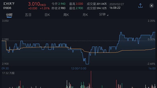 截至今日收盘,汇付天下涨1.01%,报3.01港元。