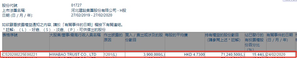 智通财经APP获悉,联交所最新资料显示,2月24日,HWABAO TRUST减持河北建设(01727)390万股,每股作价4.73港元,总金额约为1844.7万港元,减持后持股数目约为7124.05万股,持股比例为15.44%。
