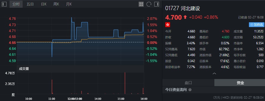 截至今日收盘,河北建设涨0.86%,报4.70港元。