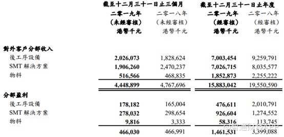 其中,2019年后工序设备业务收入为8.9亿美元,较2018年减少24.4%,毛利率按年跌472个点子;物料业务收入为2.4亿美元,较2018年减少17.8%,毛利率按年跌135个点子;SMT解决方案业务收入为9.0亿美元,较2018年减少12.6%,毛利率按年跌154个点子。