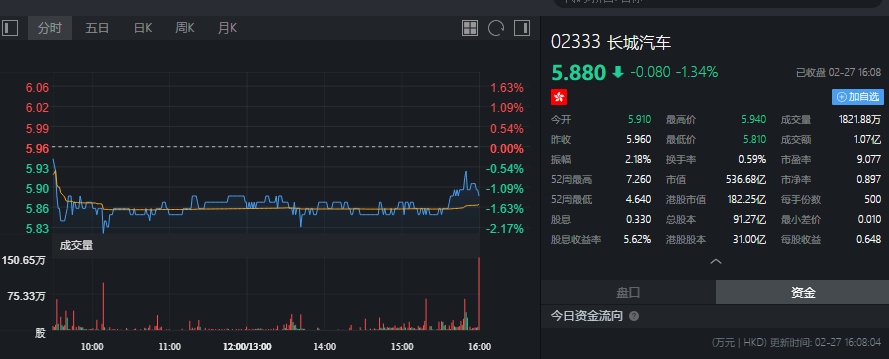 截至今日收盘,长城汽车跌1.34%,报5.88港元。