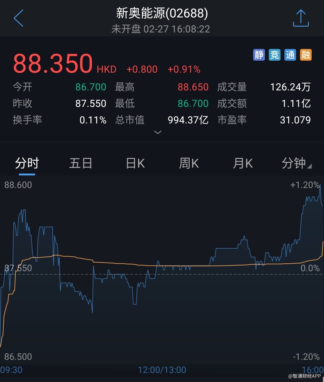 截至昨日收盘,新奥能源涨0.91%,报88.35港元。