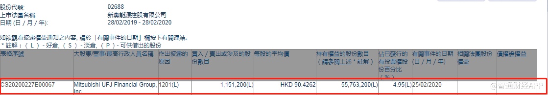 智通财经APP获悉,联交所最新资料显示,2月25日,Mitsubishi UFJ Financial Group, Inc.减持新奥能源(02688)115.12万股,每股作价90.4264港元,涉及总金额约为1.04亿港元。减持后最新持股数目约为5576.32万股,最新持股比例4.95%。