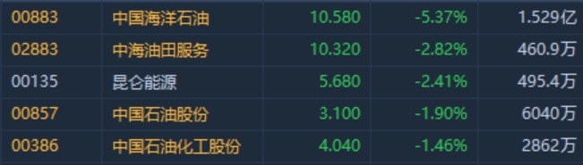 智通财经APP获悉,国际油价全线下跌,拖累港股“三桶油”集体走低,中海油(00883)暂领跌蓝筹。截至9时33分,中海油跌5.37%,报10.58港元,中石化(00386)跌1.46%,中石油(00857)跌1.9%。
