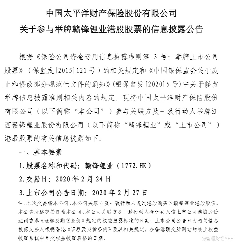 智通财经APP获悉,2月28日,中国保险行业协会官网发布中国太平洋财产保险股份有限公司(以下简称“太平洋保险”)关于举牌赣锋锂业(01772)H股股票的信息披露公告,太平洋保险表示,本次举牌赣锋锂业H股股票的参与方为太平洋保险及控股子公司中国太平洋财产保险股份有限公司、中国太平洋人寿保险股份有限公司、太保安联健康保险股份有限公司及安信农业保险股份有限公司;受托管理人为太平洋保险控股子公司太平洋资产管理有限责任公司。