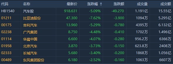 截至发稿,广汽集团(02238)跌4.26%,报8.77港元;华晨中国(01114)跌3.92%,报6.61港元;长城汽车(02333)跌3.23%,报5.69港元;东风集团股份(00489)跌2.52%,报6.18港元。