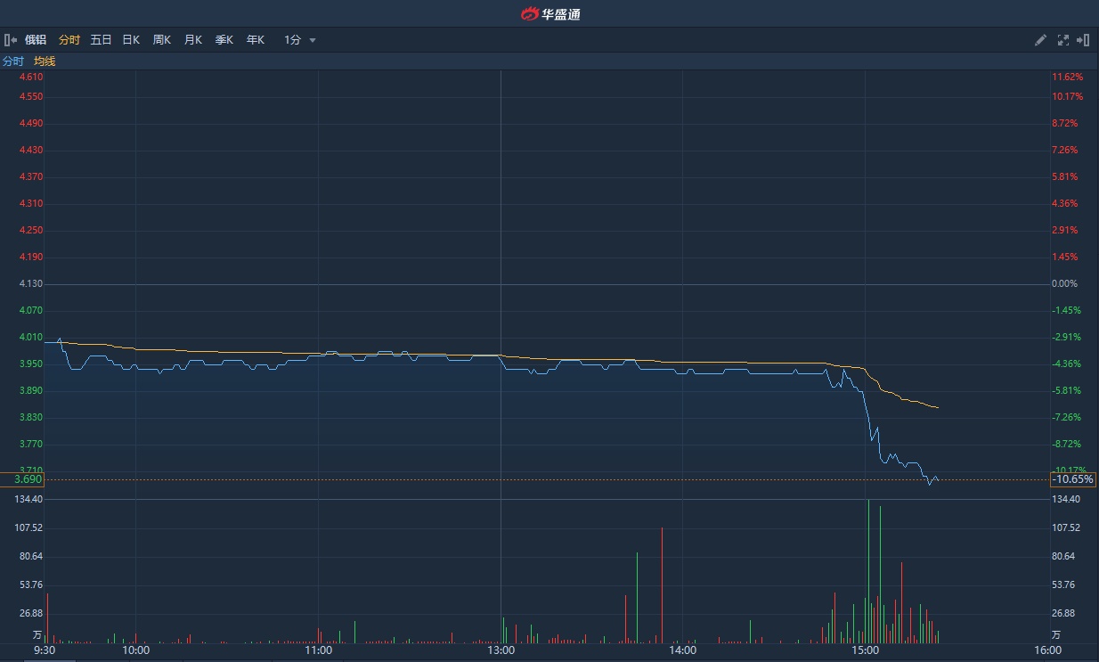 智通财经APP获悉,俄铝(00486)公布截至去年12月底止全年经营业绩,铝产量375.7万吨,同比基本持平,铝销量则上升13.8%至367.1万吨。因伦敦金属交易所期间报价按年下跌15.3%,导致平均实现价格减少15%至每吨1920美元。截至发稿,俄铝跌10.65%,报3.69港元,成交额6653.43万港元。