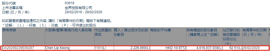智通财经APP获悉,联交所最新资料显示,2月26日,行政总裁兼执董Chen Lip Keong增持金界控股(03918)222.6万股,每股作价10.9772港元,涉及总金额约为2443.52万港元。增持后最新持股数目约为40.16亿股,最新持股比例92.51%。