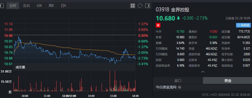 截至今日收盘,金界控股跌2.73%,报10.68港元。