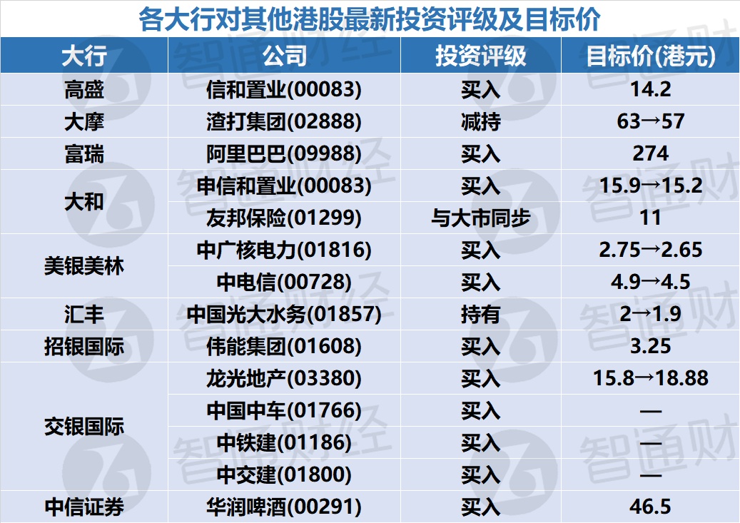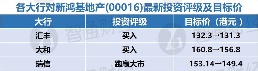 三、各大行对新鸿基地产(00016)最新投资评级及目标价