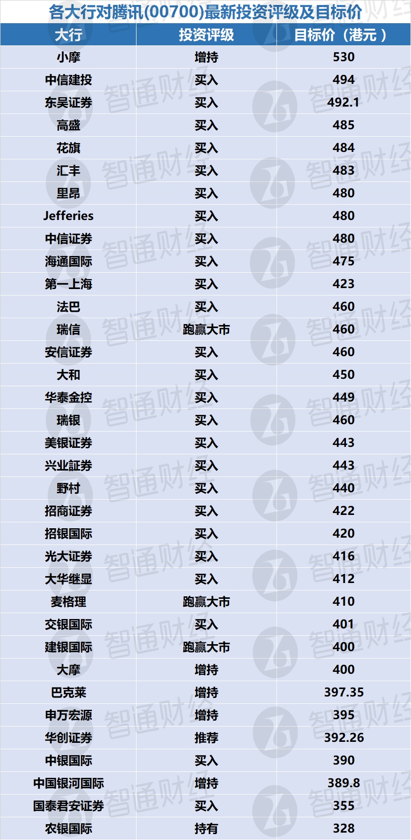 四、各大行对腾讯(00700)最新投资评级及目标价