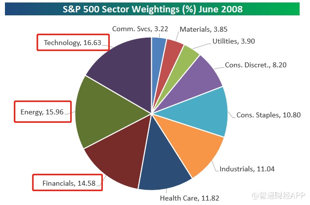 从下图也不难看出,能源板块在标普500指数中的权重已降至近30年以来最低位。相比来看,能源板块最辉煌的时刻则是在2008年6月,当时该板块是标普500指数中的第二大板块,与科技板块相差不到70个基点。到2008年年中,能源、科技、金融板块是对业绩影响最大的“三巨头”。