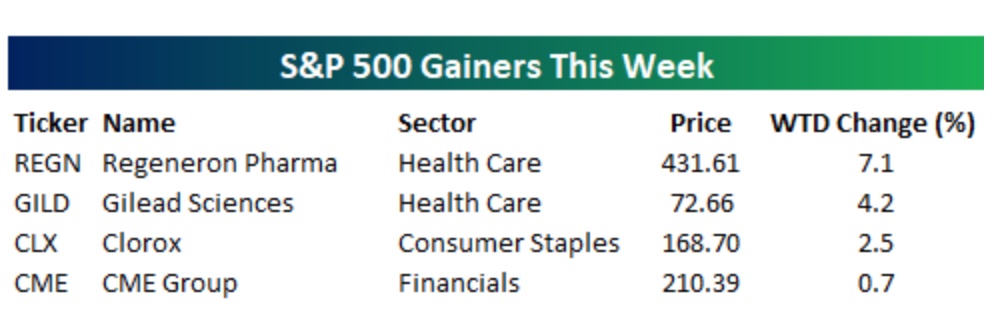 本周截至目前上涨的四只股票中,领涨的是再生元制药(REGN.US),上涨了7.1%,而吉利德科学(GILD.US)上涨了4%。除这两只股票外,目前唯一高于上周五收盘水平的股票是高乐氏(CLX.US)和芝加哥商品交易所集团(CME.US)。