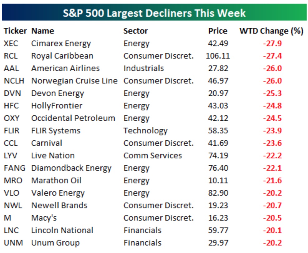 从下跌趋势来看,累计下跌的股票要多得多,但因空间有限,本文只列出标准普尔500指数中仅本周就下跌20%以上的17只股票。纵观榜单,皇家加勒比邮轮(RCL.US)、挪威邮轮(NCLH.US)和嘉年华邮轮(CCL.US)都是各大邮轮公司的代表。除了这些名字,美国航空(AAL.US)下跌了26%,而全球最大音乐现场活动承办公司LiveNation (LYV.US)下跌了22.2%。