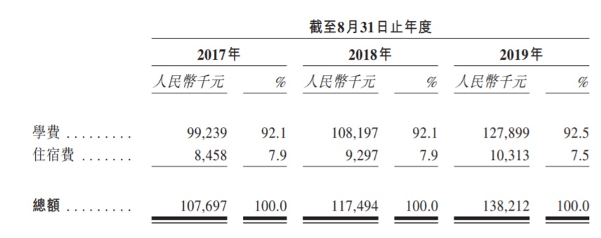 同期,本科课程的平均学费由2017年的13144元增至2019年的约15492元,学校收取的学费分别占总收入的约92.1%、92.1%及92.5%。