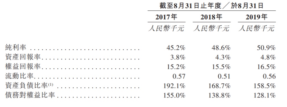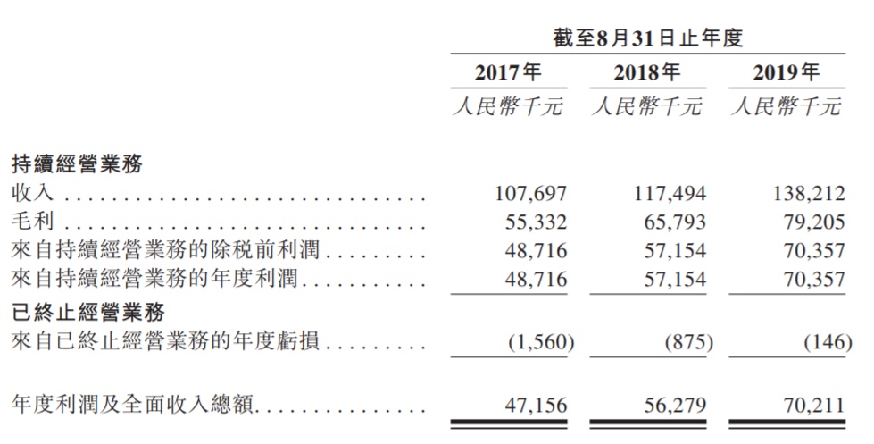 截至2017年、2018年及2019年8月31日止年度,其来自持续经营业务的纯利分别为4870万元、5720万元及7040万元,复合年增长率约为20.2%。同期,毛利分别约为5530万元、6580万元及7920万元,毛利率分别为51.4%、56%及57.3%。