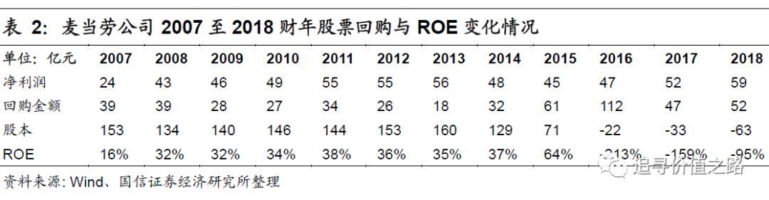下面这个表报告了麦当劳公司(MCD.US)从2007至2018财年股票回购与ROE变化情况,可以看到,在2014年以前,公司的ROE大致在35%左右。然后开始了大量回购,2015年ROE到了64%,2016年以后公司的股本为负,使得ROE都是负的了。
