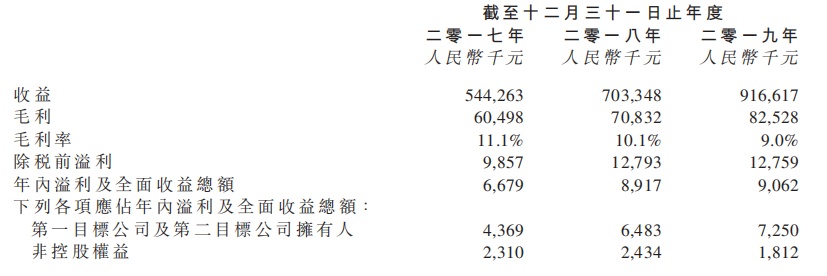 业绩方面,2017-2019年,收购的目标集团公司的收益分别为5.44亿(单位下同)、7.03亿和9.17亿,毛利率分别为11.1%,10.1%,9.0%。