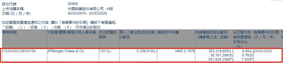 智通财经APP获悉,联交所最新资料显示,2月25日,摩根大通减持中国铝业(02600)533.801万股,每股作价2.1678港元,涉及总金额约为1157.17万港元。减持后最新持股数目约为3.53亿股,最新持股比例8.95%。