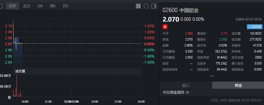截至发稿,中国铝业无涨跌,报2.07港元。