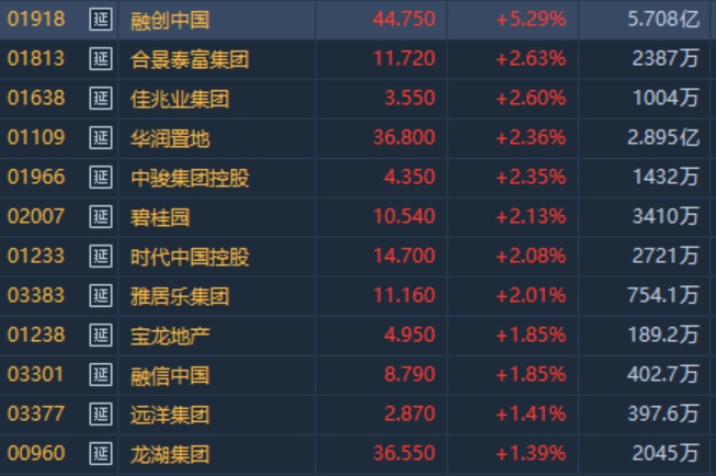 截至10时29分,融创中国(01918)涨5.29%,报价44.75港元,佳兆业集团(01638)涨2.6%,碧桂园(02007)涨2.13%,宝龙地产(01238)涨1.85%,融信中国(03301)涨1.85%。