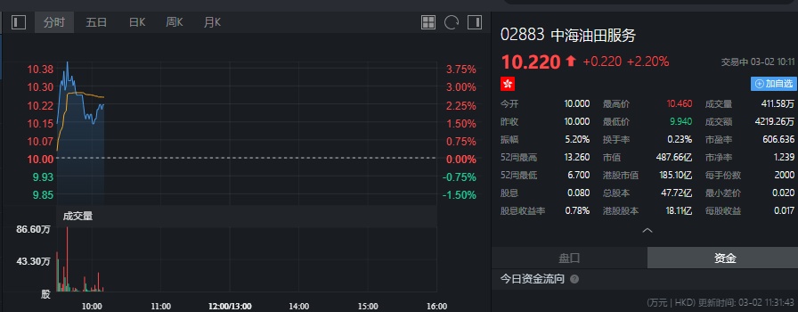 截至发稿,中海油田服务涨2.2%,报10.22港元。