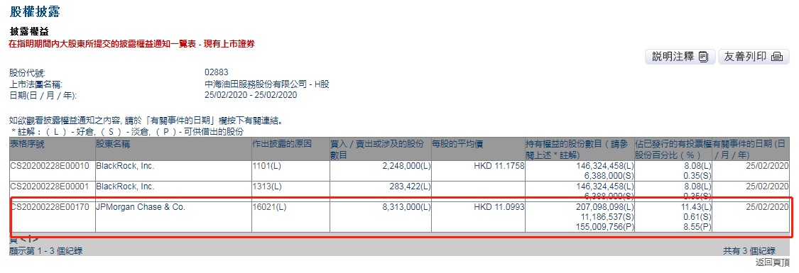 智通财经APP获悉,联交所最新资料显示,2月25日,摩根大通增持中海油田服务(02883)831.3万股,每股作价11.0993港元,总金额约为9227万港元。增持后最新持股数目约为2.07亿股,最新持股比例为11.43%。